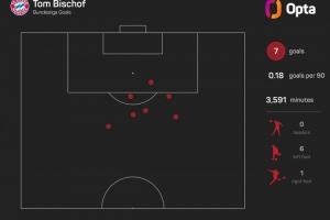 据Opta统计,比朔夫上赛季以来在德甲打进7球,其中6球是禁区外破门,同期德甲禁区外进球数量仅少于凯恩(7球)。