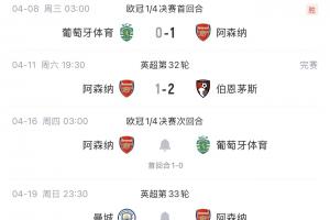 欧冠1/4决赛,阿森纳客场1-0战胜葡萄牙体育;英超方面首回合交手,阿森纳1-1战平曼城!