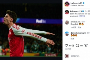 阿森纳球员哈弗茨社媒晒出庆祝的照片,配文:“半决赛我们来了,迎接一个重要的周末。”