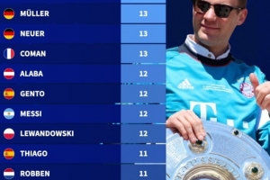 吉格斯、穆勒、诺伊尔、金斯利·科曼:13次